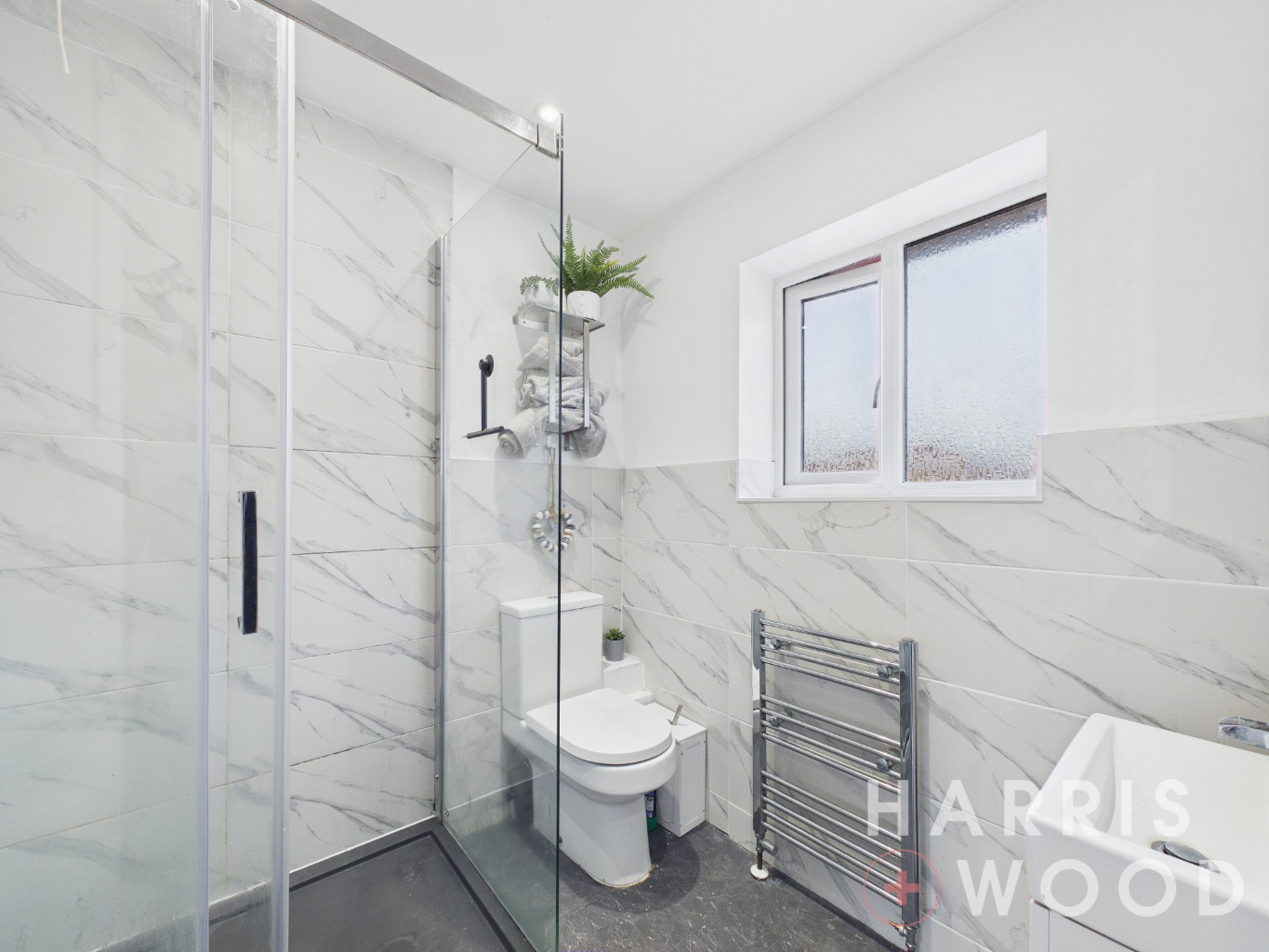 Double glazed window, low level WC, wash hand basin, shower cubicle, partly tiled walls, heated towel rail